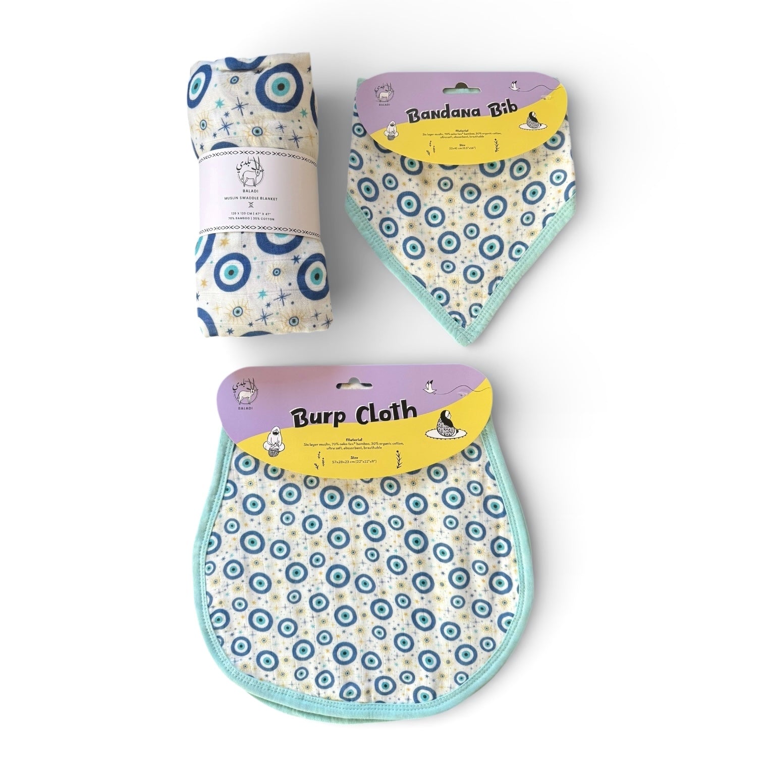 This matching Blue Eye set is perfect as a gift or for everyday use. It includes a swaddle, a bandana bib, and a burp cloth in the same print. Thoughtful, coordinated, and made with soft, breathable materials, it is a beautiful way to welcome a new baby.