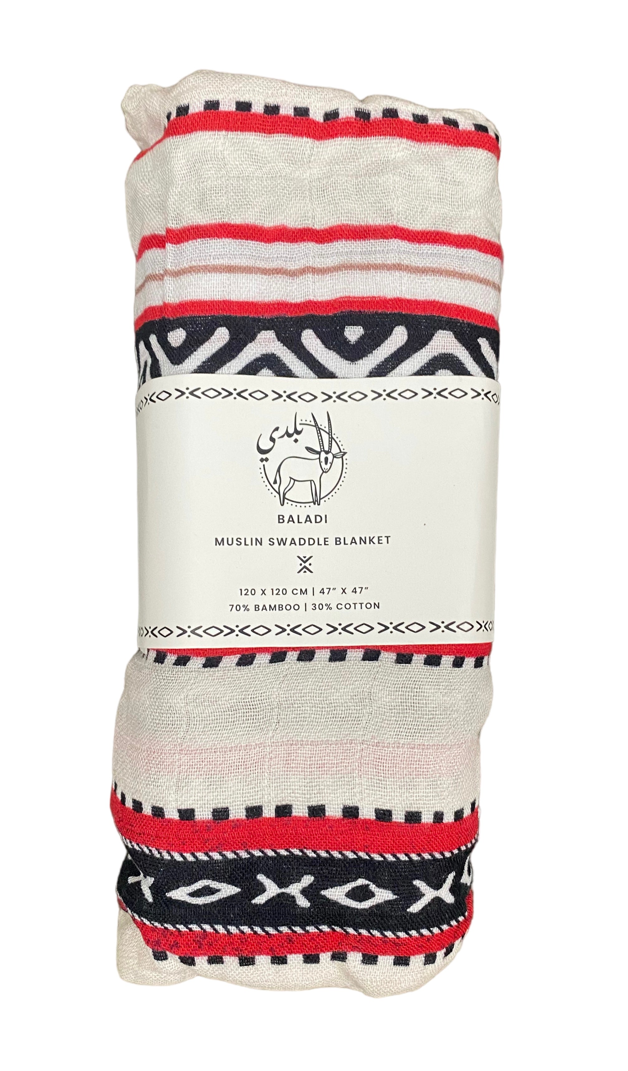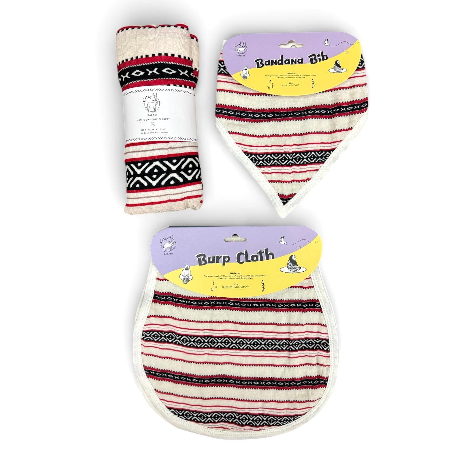 This matching Sadu set is perfect as a gift or for everyday use. It includes a swaddle, a bandana bib, and a burp cloth in the same print. Thoughtful, coordinated, and made with soft, breathable materials, it is a beautiful way to welcome a new baby.