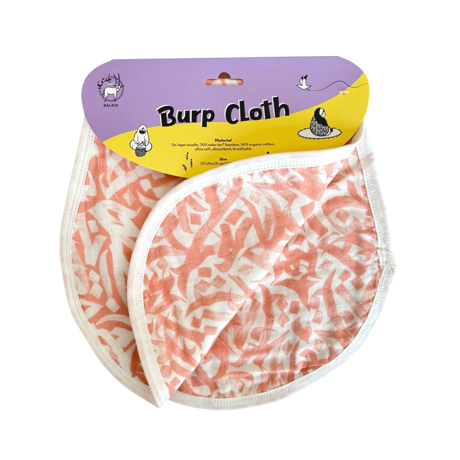 Celebrate the timeless beauty of Arabic calligraphy with this elegant burp cloth in soothing coral tones. Designed to evoke a sense of peace and refinement, it’s the perfect blend of cultural artistry and modern style for your baby’s daily moments.